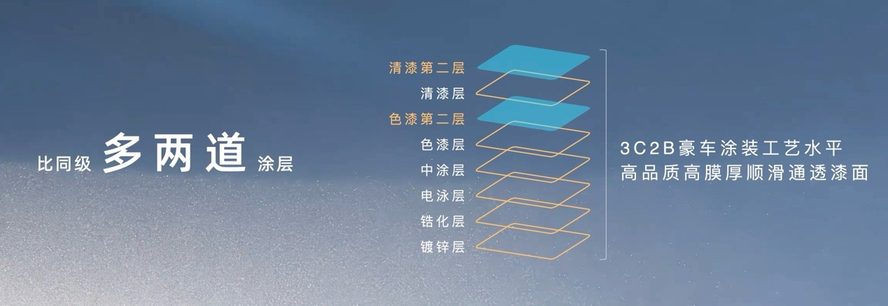 为了让i60更好看、更高级,设计师在车漆工艺上花了很大功夫。埃安i60比同级多了一道色漆层和一道清漆层,达到了豪车级别的“3C2B车漆喷涂工艺”水平,让漆面显得更精致,同时也更耐磨。两道清漆层达到双倍抗氧化、抗紫外线的效果,防腐性能更优异,让车漆经久不褪色。